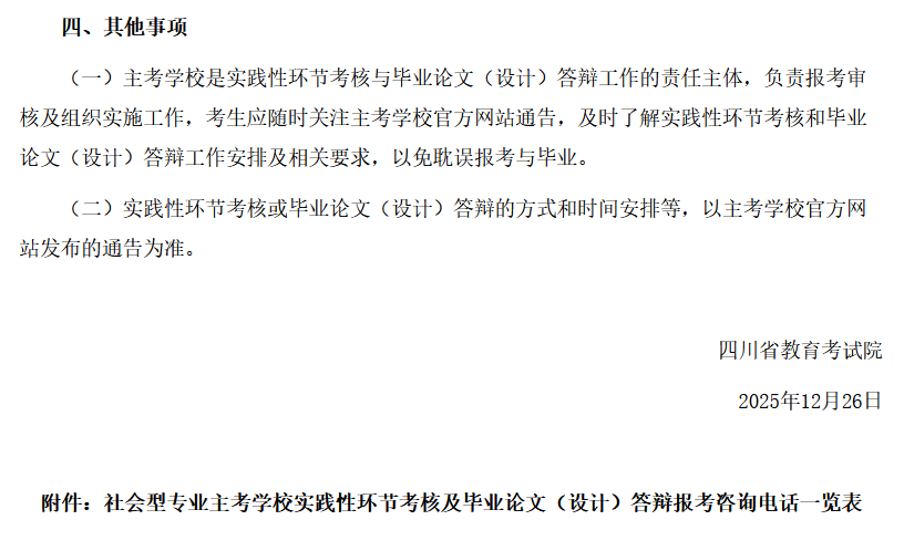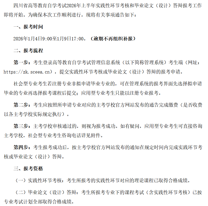 四川省关于做好2026年上半年自考实践性环节考核和毕业论文(设计)答辩工作通知